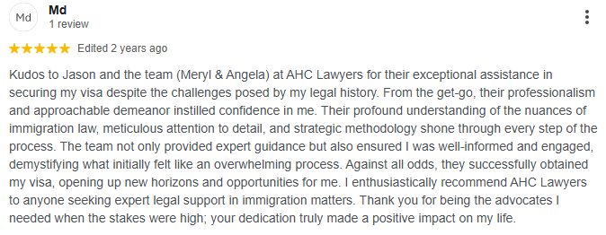 Kudos to Jason and the team (Meryl & Angela) at AHC Lawyers for their exceptional assistance in securing my visa despite the challenges posed by my legal history. From the get-go, their professionalism and approachable demeanor instilled confidence in me. Their profound understanding of the nuances of immigration law, meticulous attention to detail, and strategic methodology shone through every step of the process. The team not only provided expert guidance but also ensured I was well-informed and engaged, demystifying what initially felt like an overwhelming process. Against all odds, they successfully obtained my visa, opening up new horizons and opportunities for me. I enthusiastically recommend AHC Lawyers to anyone seeking expert legal support in immigration matters. Thank you for being the advocates I needed when the stakes were high; your dedication truly made a positive impact on my life.