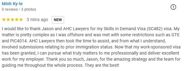 I would like to thank Jason and AHC Lawyers for my Skills in Demand Visa (SC482) visa. My matter is pretty complex as I was offshore and was met with some restrictions such as GTE and PIC4014. AHC Lawyers then took the time to assist, and from what I understand, involved submissions relating to prior immigration status. Now that my work-sponsored visa has been granted, I can pursue what truly matters to me professionally and deliver excellent work for my employer. Thank you so much, Jason, for the amazing strategy and the team for guiding me throughout the whole process. They are the best!
