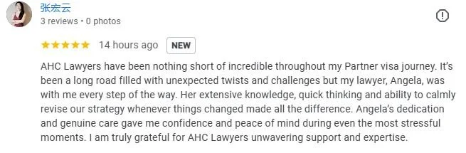 AHC Lawyers have been nothing short of incredible throughout my Partner visa journey. It’s been a long road filled with unexpected twists and challenges but my lawyer, Angela, was with me every step of the way. Her extensive knowledge, quick thinking and ability to calmly revise our strategy whenever things changed made all the difference. Angela’s dedication and genuine care gave me confidence and peace of mind during even the most stressful moments. I am truly grateful for AHC Lawyers unwavering support and expertise.