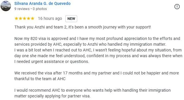 Now my 820 visa is approved and I have my most profound appreciation to the efforts and services provided by AHC, especially to Anzhi who handled my immigration matter.