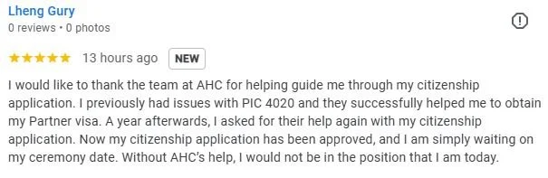 I would like to thank the team at AHC for helping guide me through my citizenship application. I previously had issues with PIC 4020 and they successfully helped me to obtain my Partner visa. A year afterwards, I asked for their help again with my citizenship application. Now my citizenship application has been approved, and I am simply waiting on my ceremony date. Without AHC’s help, I would not be in the position that I am today.