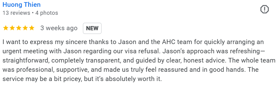 I want to express my sincere thanks to Jason and the AHC team for quickly arranging an urgent meeting with Jason regarding our visa refusal. Jason’s approach was refreshing—straightforward, completely transparent, and guided by clear, honest advice. The whole team was professional, supportive, and made us truly feel reassured and in good hands. The service may be a bit pricey, but it’s absolutely worth it.