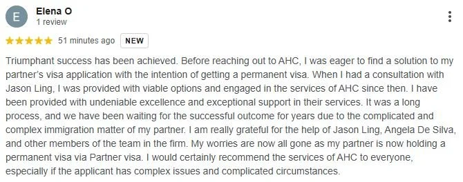 Triumphant success has been achieved. Before reaching out to AHC, I was eager to find a solution to my partner’s visa application with the intention of getting a permanent visa. When I had a consultation with Jason Ling, I was provided with viable options and engaged in the services of AHC since then. I have been provided with undeniable excellence and exceptional support in their services. It was a long process, and we have been waiting for the successful outcome for years due to the complicated and complex immigration matter of my partner. I am really grateful for the help of Jason Ling, Angela De Silva, and other members of the team in the firm. My worries are now all gone as my partner is now holding a permanent visa via Partner visa. I would certainly recommend the services of AHC to everyone, especially if the applicant has complex issues and complicated circumstances.