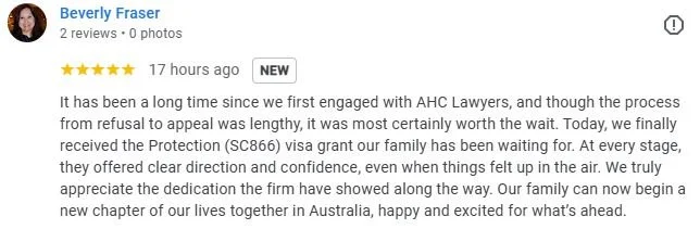 It has been a long time since we first engaged with AHC Lawyers, and though the process from refusal to appeal was lengthy, it was most certainly worth the wait. Today, we finally received the Protection (SC866) visa grant our family has been waiting for. At every stage, they offered clear direction and confidence, even when things felt up in the air. We truly appreciate the dedication the firm have showed along the way. Our family can now begin a new chapter of our lives together in Australia, happy and excited for what’s ahead.