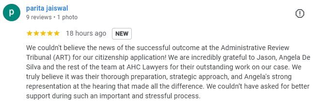 We couldn't believe the news of the successful outcome at the Administrative Review Tribunal (ART) for our citizenship application! We are incredibly grateful to Jason, Angela De Silva and the rest of the team at AHC Lawyers for their outstanding work on our case. We truly believe it was their thorough preparation, strategic approach, and Angela's strong representation at the hearing that made all the difference. We couldn’t have asked for better support during such an important and stressful process.