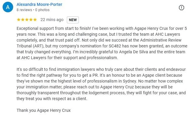 Exceptional support from start to finish! I've been working with Agape Henry Crux for over 5 years now. This was a long and challenging case, but I trusted the team at AHC Lawyers completely, and that trust paid off. Not only did we succeed at the Administrative Review Tribunal (ART), but my company's nomination for SC482 has now been granted, an outcome that truly changed everything. I’m incredibly grateful to Angela De Silva and the entire team at AHC Lawyers for their support and professionalism.