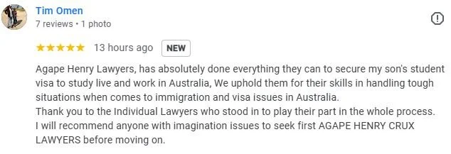 Agape Henry Lawyers, has absolutely done everything they can to secure my son's student visa to study live and work in Australia, We uphold them for their skills in handling tough situations when comes to immigration and visa issues in Australia.