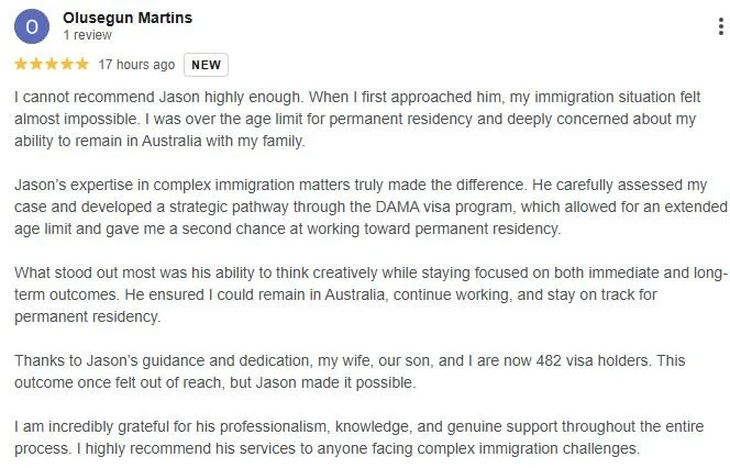 I cannot recommend Jason highly enough. When I first approached him, my immigration situation felt almost impossible. I was over the age limit for permanent residency and deeply concerned about my ability to remain in Australia with my family.