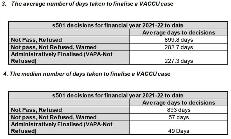 The average processing time for a VACCU assessment can vary significantly based on several factors. Generally, applicants can expect the process to take anywhere from 1 month to 2 years, according to the Freedom of Information (FOI). Average processing times may fluctuate depending on the complexity of your case. The average days for a Section 501 decision to finalise between 2021 and 2022 are listed below: